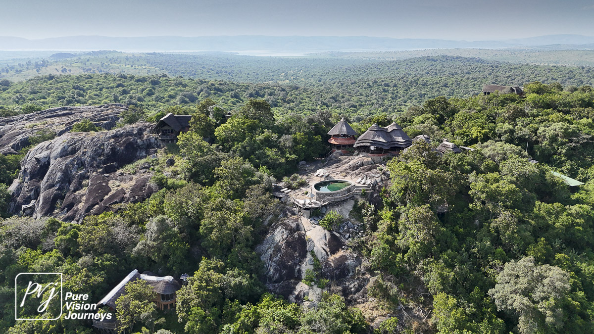 This photo gallery showcases an aerial view of Mihingo Lodge.